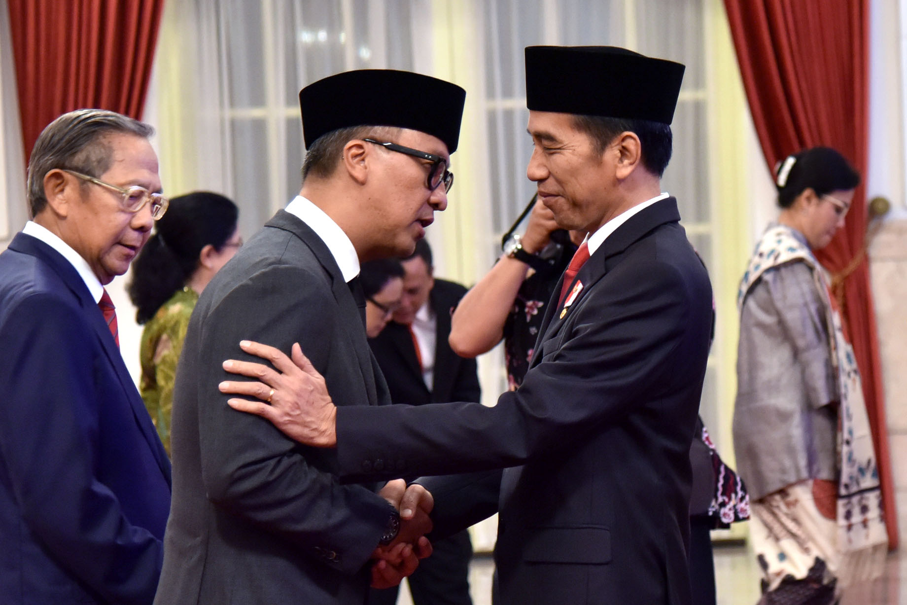 Tampak hadir dalam pelantikan tersebut Mensesneg Pratino, Seskab Pramono Anung, Kepala Staf Kepresidenan Moeldoko, Menlu Retno Marsudi, Menkeu Sri Mulyani Indrawati, Menperin Airlangga Hartarto, Menaker Hanif Dhakiri, Menteri ESDM Ignasius Jonan, Menkes Nila F. Moeloek, Panglima TNI Marsekal Hadji Tjahjanto, dan Ketua DPD-RI Oesman Sapta. (kn)