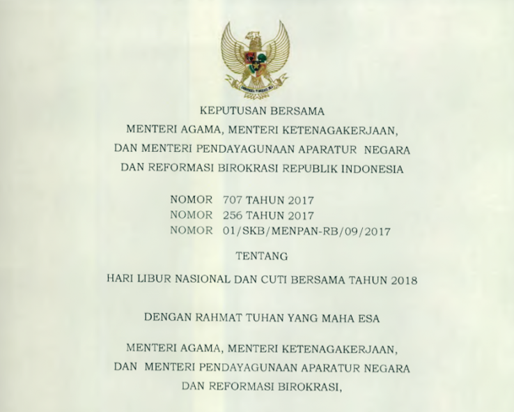 Rilis yang dikirim Humas Kemenko PMK menyebutkan, setelah melalui serangkaian pembahasan yang dikoordinasikan oleh Kementerian Koordinator Bidang Pembangunan Manusia dan Kebudayaan (Kemenko PMK), pemerintah akhirnya menerbitkan Keputusan Bersama Menteri Agama, Menteri Ketenagakerjaan, dan Menteri Pendayagunaan Aparatur Negara dan Reformasi Birokrasi Nomor 707 Tahun 2017, Nomor 256 Tahun 2017, Nomor 01/Skb/Menpan-Rb/09/2017 tentang Hari Libur Nasional dan Cuti Bersama Tahun 2018.