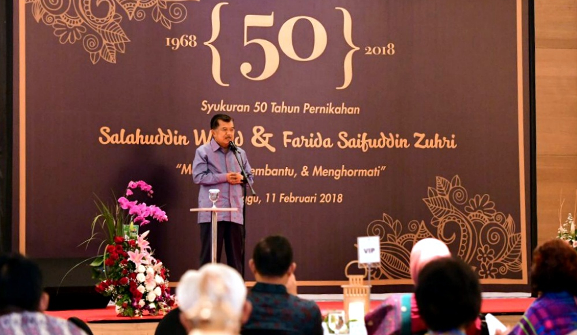 JAKARTA — Wakil Presiden Jusuf Kalla (JK) menghadiri syukuran lima puluh tahun pernikahan Salahuddin Wahid (Gus Sholah) dengan Farida Saifudin Zuhri di Hotel Luansa Kuningan, Minggu (11/2).