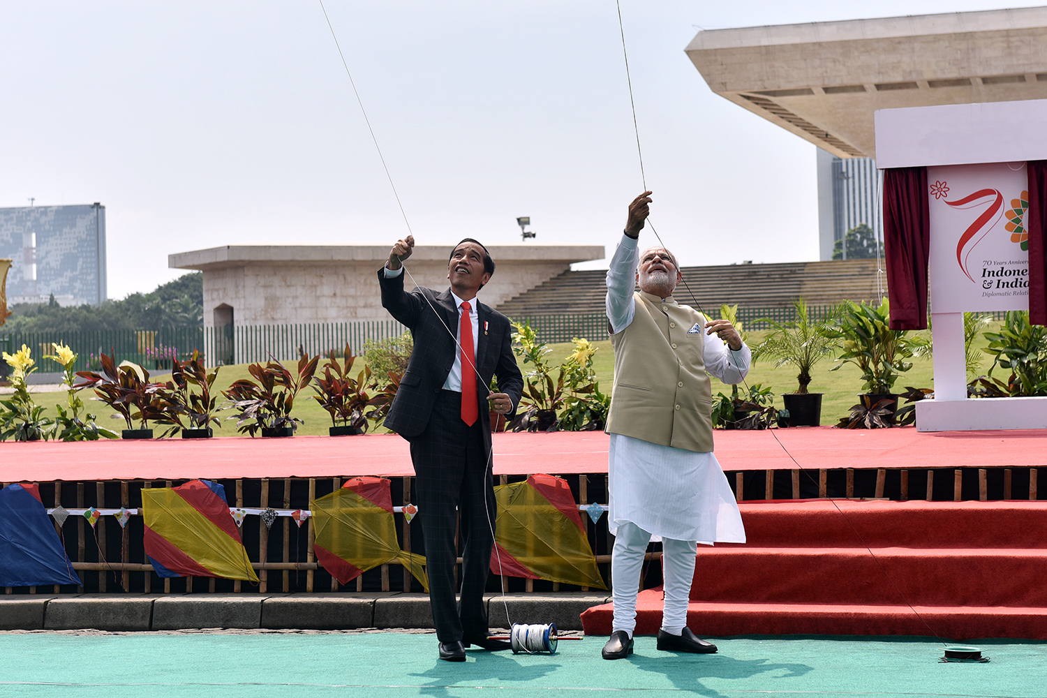 Presiden Jokowi menerbangkan layang-layang dengan motif bendera India dan bertuliskan INDIA, sebaliknya PM Modi menerbangkan layang-layang dengan logo Asian Games.