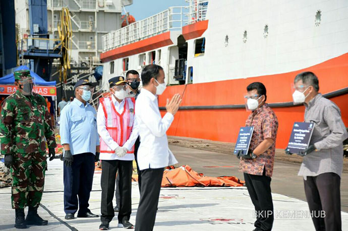 Presiden RI Joko Widodo (Jokowi) mengapresiasi kerja keras yang telah dilakukan Tim SAR Gabungan dalam penanganan musibah jatuhnya Pesawat Sriwijaya Air SJ-182. Hal tersebut disampaikan saat mengunjungi Posko Darurat Evakuasi Pesawat Sriwijaya SJ 182 yang berada di Dermaga JICT, Pelabuhan Tanjung Priok, Jakarta, Rabu (20/1/2021).