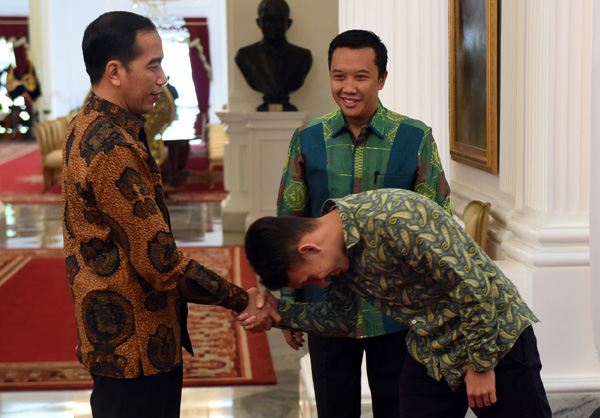 Mengenakan baju batik berwarna hijau, Egy yang datang satu mobil dengan Menpora tiba di kompleks Istana sekitar pukul 09.30 WIB, dan langsung disambut hangat oleh Presiden Jokowi di Istana Merdeka.
