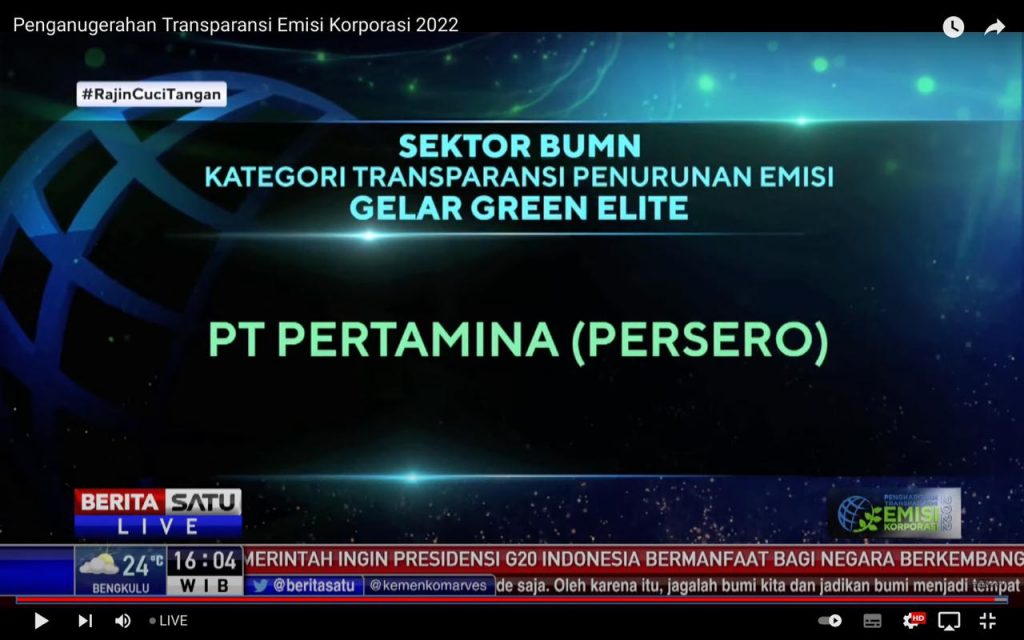 Pertamina berhasil meraih 3 penghargaan sekaligus dalam Emisi Transparansi Korporasi 2022. Tiga penghargaan yang diraih Pertamina meliputi Kategori Transparansi Perhitungan Emisi Gelar Gold Plus, Kategori Transparansi Penurunan Emisi Gelar Green Elite dan Kategori Transparansi Penurunan Emisi Gelar Green.