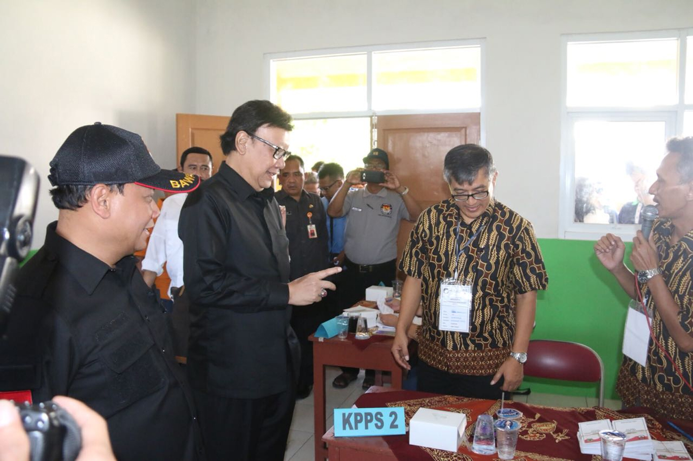 SEMARANG — Menteri Dalam Negeri (Mendagri) Tjahjo Kumolo memantau pelaksanaan pemungutan suara di tempat Sekjen Kemendagri Hadi Prabowo mencoblos, Rabu (27/6/18). Yakni di Tempat Pemungutan Suara (TPS) 06 Singotoro, Kelurahan Jomblang, Kecamatan Candisari, Kota Semarang.