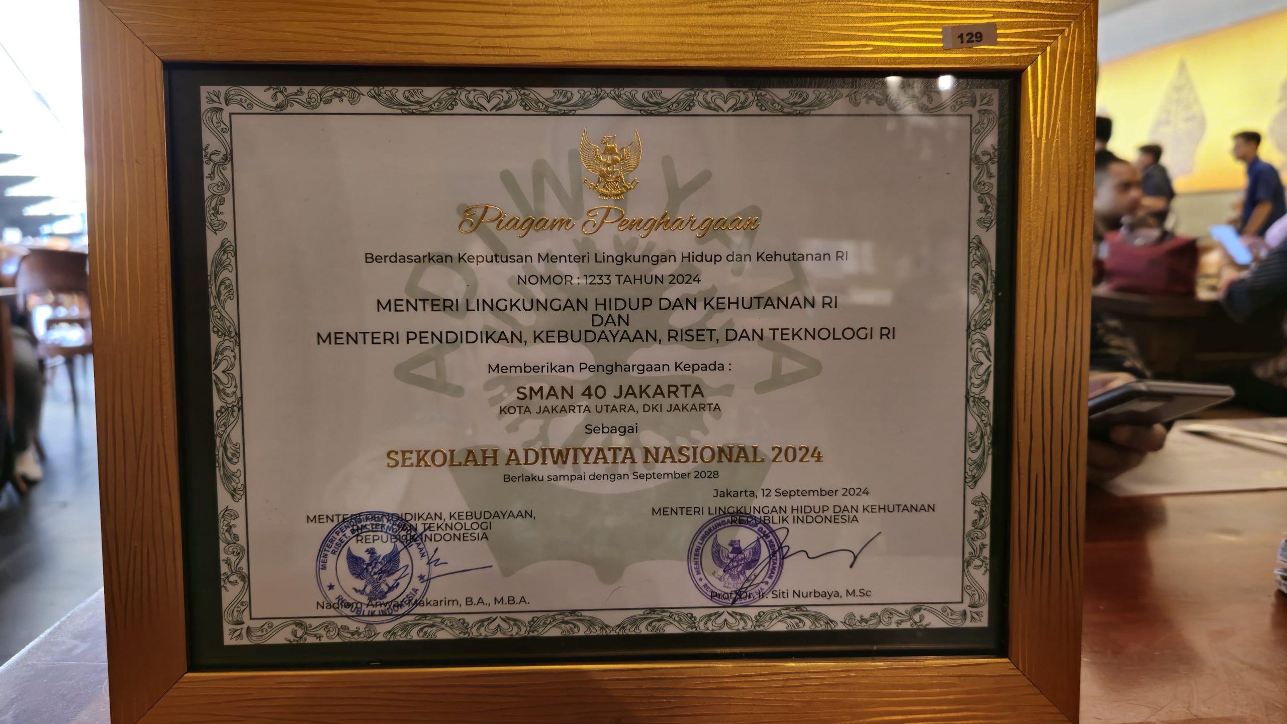 SMA Negeri 40 Jakarta dinobatkan sebagai Sekolah Adiwiyata tingkat Nasional tahun 2024, penghargaan ini diberikan langsung oleh Wakil Menteri LHK Alue Dohong di Gedung Manggala Wanabakti Kementerian Lingkungan Hidup dan Kehutanan RI pada hari Rabu (02/10/2024).