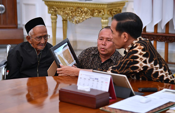 Nyak Sandang, salah satu saksi sejarah yang juga memberikan andil bersama rakyat Aceh lainnya untuk membeli pesawat pertama setelah Indonesia merdeka, Rabu 21 Maret 2018 sekitar pukul 18.25 WIB bertemu dengan Presiden Joko Widodo di Istana Merdeka.