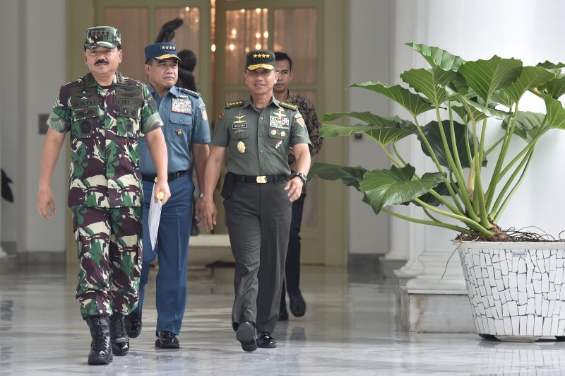 Panglima TNI Marsekal TNI Hadi Tjahjanto (kiri) didampingi KSAL Laksamana TNI Ade Supandi (tengah) dan KSAD Jenderal TNI Mulyono (kanan) meninggalkan Istana Kepresidenan Bogor usai menghadap Presiden Joko Widodo di Jawa Barat, Kamis (14/12). Pertemuan tersebut membahas proses serah terima dan transisi jabatan Panglima TNI, peningkatan industri-industri strategis untuk memenuhi kebutuhan Angkatan Darat, Angkatan Laut dan Angkatan Udara, serta membahas kesejahteraan prajurit khususnya yang bertugas di daerah perbatasan. ANTARA FOTO/Puspa Perwitasari/foc/17.