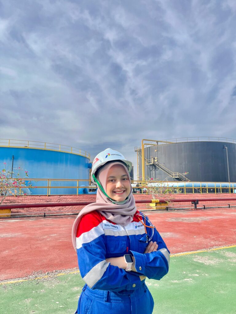 Di sisi lain, Royfa Fenandita Finadzir juga menunjukkan kiprahnya di darat sebagai Operator Plant Operations di Pertamina Hulu Rokan (PHR), tepatnya di Lapangan Minas, Riau. Ia menghadapi dinamika kerja lapangan yang menuntut adaptasi cepat. “Sebagai perempuan yang masih baru, tentu ada tantangan dalam beradaptasi dengan ritme kerja dan lingkungan operasional. Namun di situlah saya merasa tertantang untuk terus berkembang,” tuturnya.