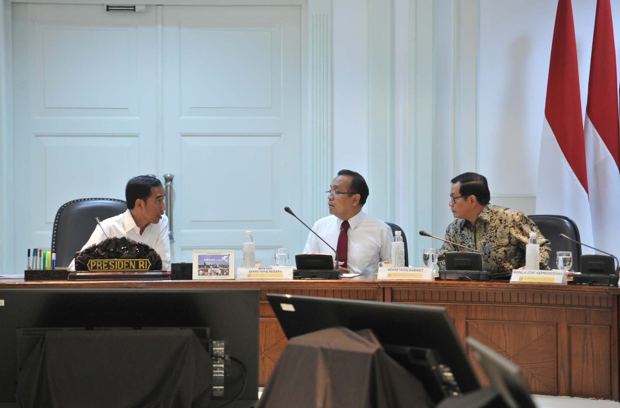 Presiden Jokowi berdiskusi dengan Mensesneg dan Seskab di sela-sela rapat terbatas, di Kantor Presiden, Jakarta, Selasa (12/9) siang. (Foto: JAY/Humas)