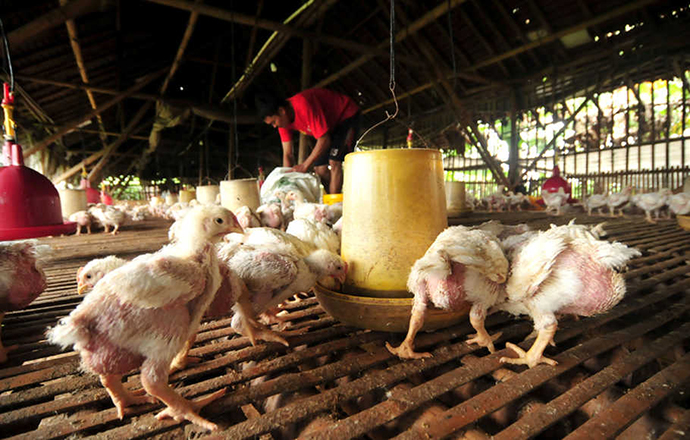 Seorang peternak memberi pakan ayam potong di Desa Wangandawa, Kabupaten Tegal, Jawa Tengah, Rabu (2/3). Menurut peternak, sejak sepekan terakhir harga ayam potong di daerah itu turun dari Rp16 ribu menjadi Rp9 ribu per ekor, tapi harga pakan naik dari Rp7.400 menjadi Rp7.800 per kilogram, akibatnya sejumlah peternak mengalami kerugian dan sebagian memilih tidak beternak. ANTARA FOTO/Oky Lukmansyah/aww/16.