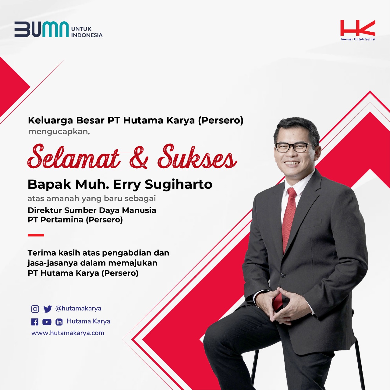 Sementara Erry Sugiharto diketahui sebelumnya pernah menjabat sebagai Direktur Human Capital and Legal PT Hutama Karya (Persero). Erry juga diketahui pernah menjabat sebagai Executive Vice President Divisi Legal Hutama Karya pada 2018-2020, Ahli Utama pada Divisi Legal Hutama Karya pada 2018, dan Kepala Wilayah III pada Direktorat Wilayah Barat di perusahaan negara yang sama dalam kurun waktu 2016-2018. (SNU/RIF)