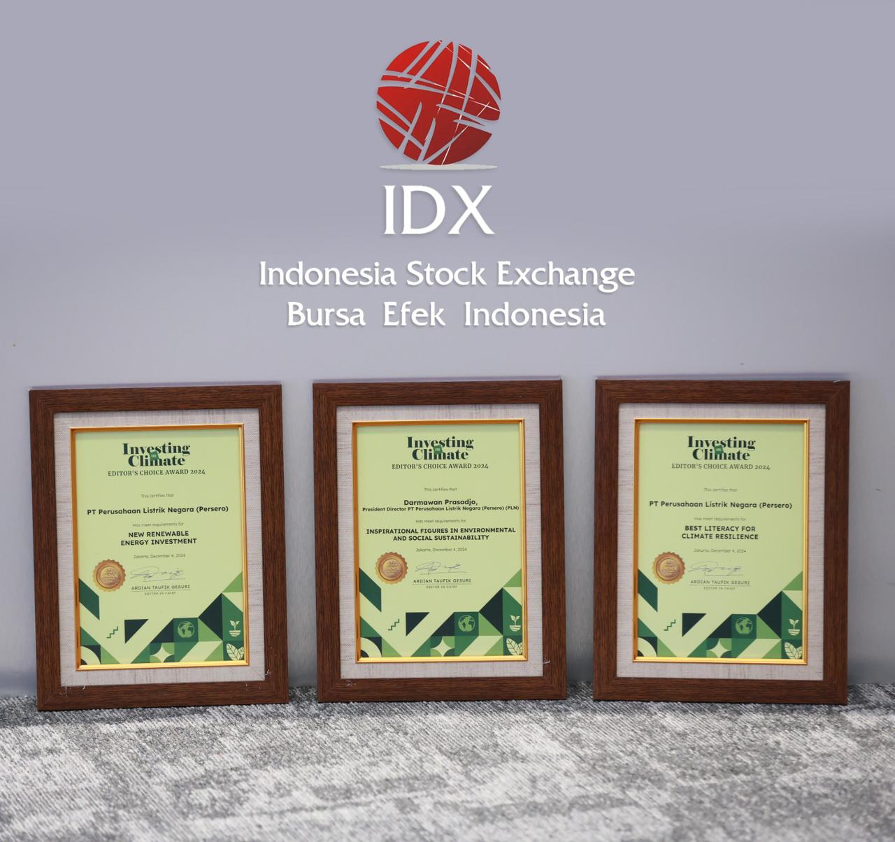 PT PLN (Persero) memborong 3 penghargaan dalam gelaran Investing on Climate Editor’s Choice Award 2024 yang dihelat di Gedung Bursa Efek Indonesia, Jakarta, Rabu (04/12). Apresiasi ini diberikan kepada PLN atas upaya nyata pengurangan emisi karbon dalam rangka mengurangi dampak perubahan iklim.