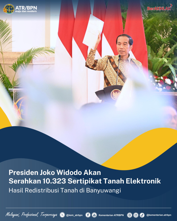 Jakarta, hotfokus.com Presiden Joko Widodo (Jokowi) akan menyerahkan sertifikat tanah elektronik di Kabupaten Banyuwangi, Jawa Timur, Selasa (30/4/2024). Presiden akan didampingi Menteri Agraria...