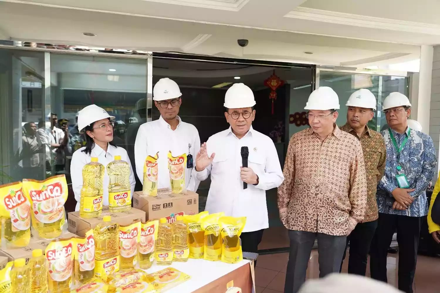 Menteri Perdagangan (Mendag), Budi Santoso (Busan), meninjau dapur pabrik minyak goreng (migor) PT Mikie Oleo Nabati Industri (MONI) di Bekasi, Jawa Barat. Kedatangannya ke dapur pabrik tersebut untuk memastikan produkksi dan pasokan migor selama Bulan Puasa dan Lebaran.